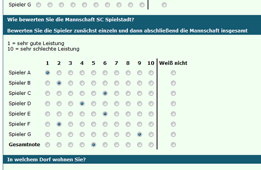 Diese Option muss inhaltlich passend sein. Der Vorteil dieses Formates besteht darin, dass die Teilnehmer die identische Skala bei der Verarbeitung beider Aufgaben (Bewertung der Einzelspieler und Bewertung der gesamten Mannschaft) heranziehen.