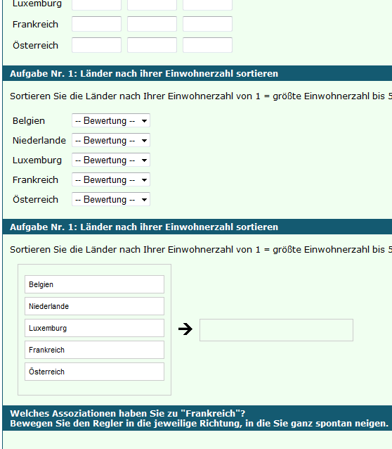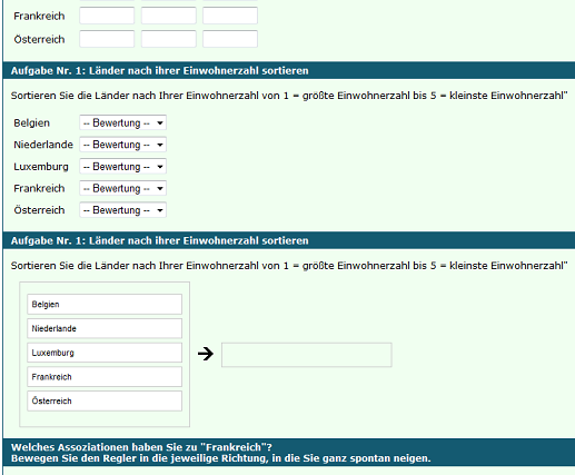 In der Auswertung erhalten Sie dann Zahlenwerte. Das Feld ganz oben erhält die niedrigste Zahl, das Feld ganz unten die höchste Zahl. In diesem Beispiel mit fünf Nationen, also fünf Feldern, erhält das obere Feld die Zahl 1, das unterste die Zahl 5. Die Zahlen sind ebenfalls nur in Beziehung zueinander zu interpretieren. Auch hier gilt: Wenn Sie absolute Werte erheben wollen, dann bietet es sich an, das Format